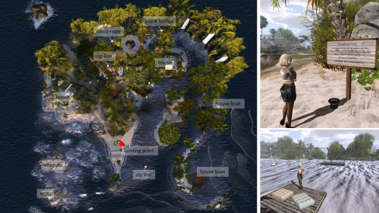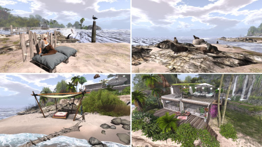 Close to the landing point is an inviting sign: “Welcome dear visitor. Everybody is welcome to explore our sim. Find our sealgroup near the ocean, wander trough the rainforest up to the hill, take a boat to feel the swamp … just have a great day. greetings Jaccy, Magy and Tira”