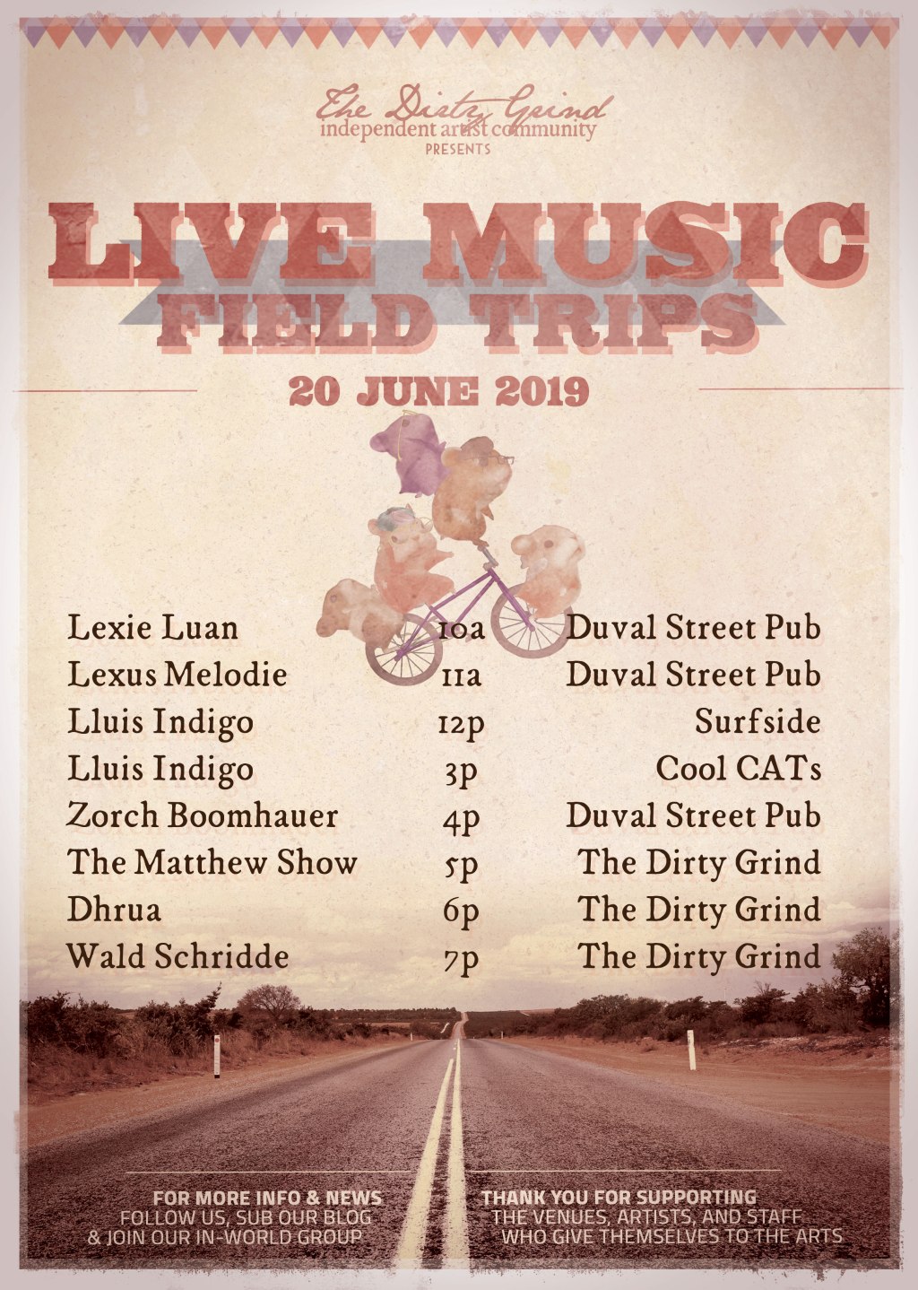 Happy Thursday everyone! There’s SO much quality live music for you today, make sure you don’t miss it! Follow the field trips and then join us at The Dirty Grind IAC for a great party!