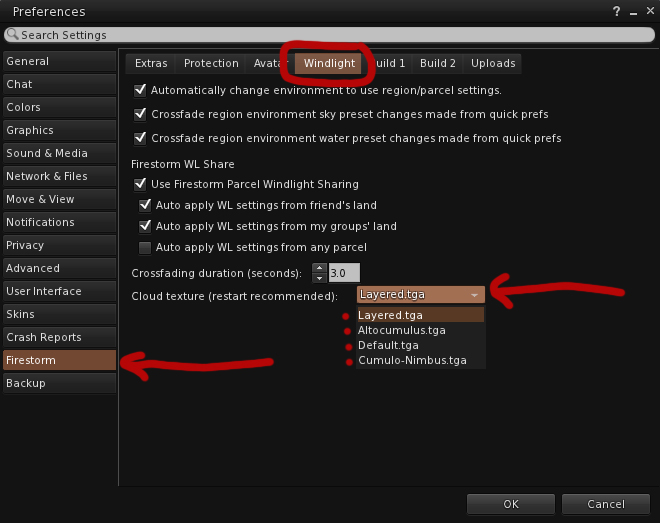 Did you know that you can change the style of your clouds inside the Firestorm viewer? Maybe you can inside the SL viewer too I don’t know. But I am talking about the Firestorm viewer today. What you do is go to Preferences and follow this image….