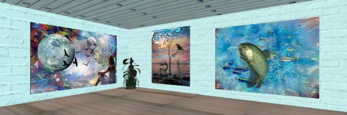The upper three floors of the gallery continue to present Sisi’s own artwork, which as I’ve noted before is the most extraordinary digital work. Produced in the physical world and then uploaded to Second Life, Sisi’s art is the very definition of crossing and re-crossing the digit divide: a physical world artist who produces the must remarkable digital pieces for upload to a digital world, allowing it to be seen and purchased by a global physical world audience.