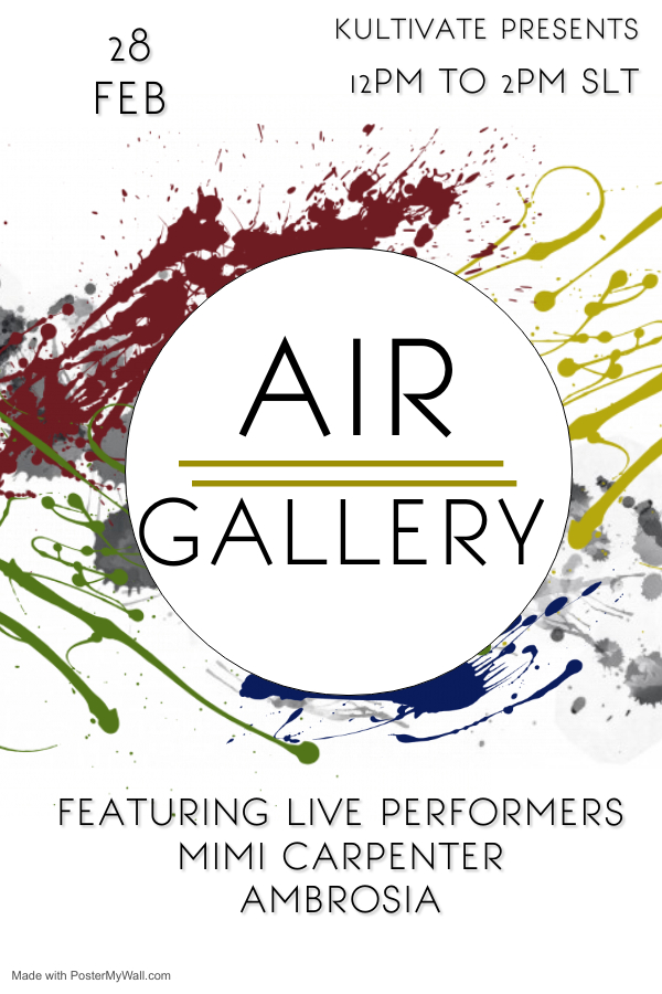 Join us at Kultivate AIR (Artist in Residence) Gallery on Sunday, February 28 from 12 to 2pm slt as Kultivate presents its newest artists in residence! This event will feature the following artists: