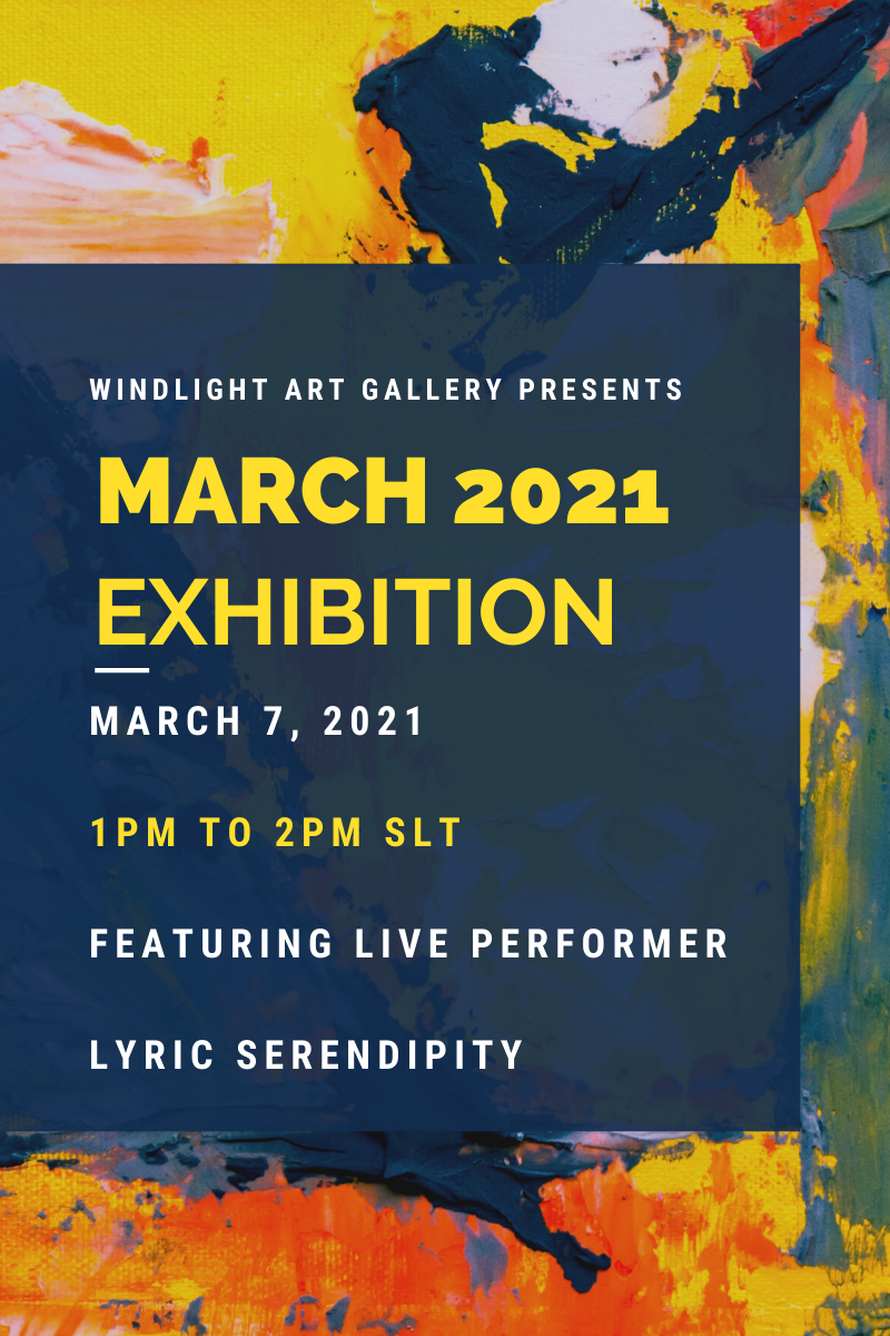 Join us at Windlight Art Gallery on Sunday, March 7, 2021 from 1pm to 2pm slt for the March exhibition opening at Windlight Art Gallery! The event will feature live performer Lyric Serendipity with a casual dress code! The following artists are exhibiting:
