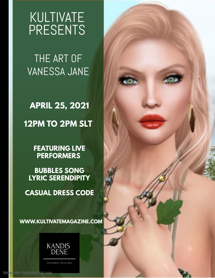 Join us on Sunday, April 25, 2021 from 12 to 2pm slt for Kultivate presents the Art of Vanessa Jane! The exhibition will take place at Kultivate Select Gallery and will feature live performers Bubbles Song (12pm to 1pm slt) and Lyric Serendipity (1pm to 2pm slt).